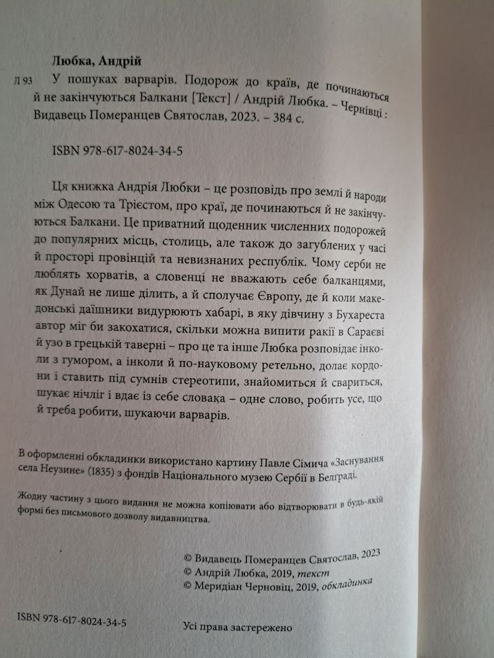 Нова книжка Андрія Любки – це розповідь про землі й народи між Одесою та Трієстом, про краї, де починаються й не закінчуються Балкани. Це приватний щоденник численних подорожей до популярних місць, столиць, але також до загублених у часі й просторі провінцій та невизнаних республік. Чому серби не люблять хорватів, а словенці не вважають себе балканцями, як Дунай не лише ділить, а й сполучає Європу, де й коли македонські даїшники видурюють хабарі, в яку дівчину з Бухареста автор міг би закохатися, скільки можна випити ракії в Сараєві й узо в грецькій таверні – про це та інше Любка розповідає інколи з гумором, а інколи й по-науковому ретельно, долає кордони і ставить під сумнів стереотипи, знайомиться й свариться, шукає нічліг і вдає із себе словака – одне слово, робить усе, що й треба робити, шукаючи варварів.
