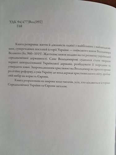 Книга розкриває життя й діяльність однієї з найбільших і найзагадковіших, суперечливих постатей історії України — київського князя Володимира Великого (бл. 960–1015). Життєпис князя подано на тлі розвитку української середньовічної державності. Саме Володимирові судилося стати творцем першої централізованої Української держави, розбудувати її зсередини та утвердити зовні. Запровадженням християнства Володимир не просто провів релігійну реформу, а увів Україну до кола держав християнського світу, зробив свій вибір на користь Європи. Книга розрахована на широке коло читачів, усіх, хто цікавиться історією Середньовічної України та Європи загалом.